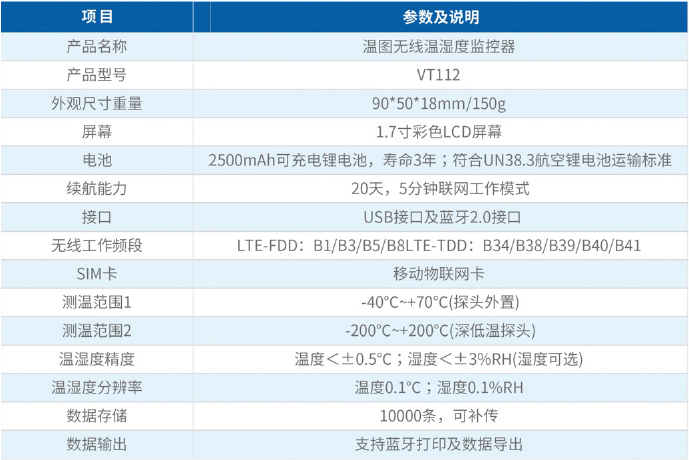 VT112是无锡必创科技(以下简称 “我公司” )自主研发生产的一款集温湿度采集、存储、LCD屏显、无线传输为一体的智能温控产品。本产品广泛应用于冷藏药品质量安全监控的各个环节和领域,全面符合国家新版GSP关于药品存储、运输的冷链规范要求。该产品与我公司冷链温湿度监测云平台结合,为客户提供自助式冷链服务。 产品采用4G无线通信技术,与云端服务器通信实现上报温湿度数据、报警数据及产品参数同步等,产品具有数据存储、基站定位、USB数据导出本地、无线蓝牙打印凭条等功能。